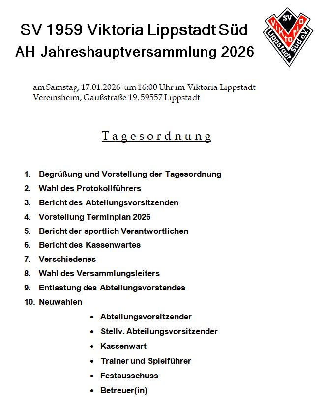 Am Samstag, 17.01.26 steht im Vereinsheim die diesjährige Jahreshauptversammlung der AH-Abteilung an. Für alle Interessierten geht es um 16:00 Uhr los.